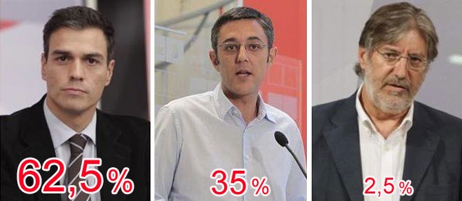 Un 62,5% de los votos recogidos en la sede socialista de Abarán en las elecciones celebradas este domingo para elegir al nuevo secretario general del PSOE, fueron para Pedro Sánchez. El resto de los votos emitidos se repartieron entre Eduardo Madina, 35%, y Pérez Tápias, 2,5%. La participación alcanzó un 67,8%, no registrándose ningún voto en blanco ni nulo.