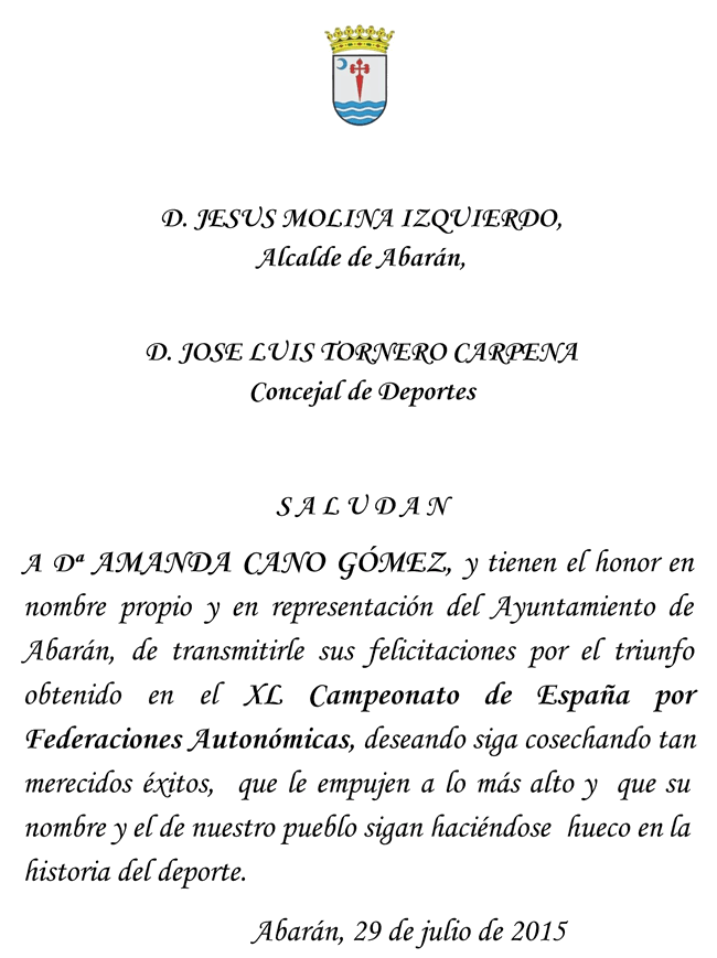 - A Dª Amanda Cano Gómez, por el triunfo obtenido en el XL Campeonato de España por Federaciones Autonómicas, deseando siga cosechando tan merecidos éxitos que le empujan a lo más alto, y que su nombre y el de nuestro pueblo sigan haciéndose hueco en la historia del deporte.