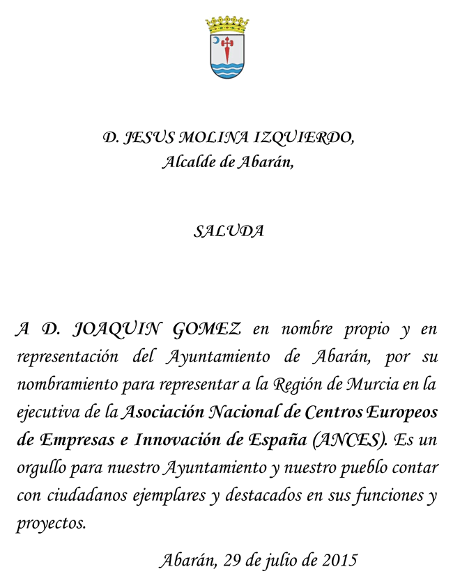 - A D. Joaquín Gómez Gómez por su nombramiento para representar a la Región de Murcia en la ejecutiva de la Asociación Nacional de Centros Europeos de Empresas e Innovación de España. Es un orgullo para nuestro Ayuntamiento y nuestro pueblo contar con ciudadanos ejemplares y destacados en sus funciones y proyectos.