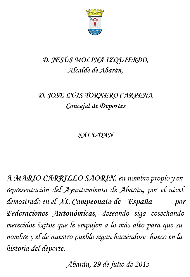 - A  D. Mario Carrillo Saorín por el nivel demostrado en el XL Campeonato de España por Federaciones Autonómicas, deseando siga cosechando merecidos éxitos que le empujan a lo más alto para que su nombre y el de nuestro pueblo sigan haciéndose hueco en la historia del deporte.