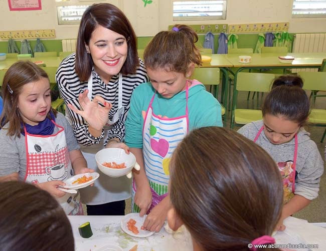 Fueron los alumnos de tercero de Primaria quienes tuvieron la suerte de poder meterse en el papel de pequeños aprendices de cocina y, siguiendo las indicaciones de la experta en gastronomía, poner en práctica, con más o menos destreza, sus habilidades culinarias para elaborar una exquisita receta en la que no faltaron las verduras, en este caso el calabacín y el tomate.