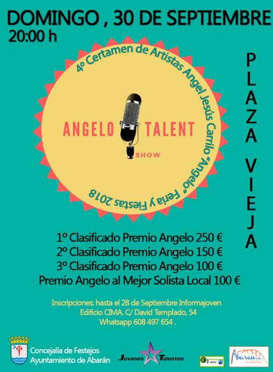 Tras los éxitos obtenidos en los tres años anteriores, para el domingo 30 de septiembre está programado la cuarta edición del Certamen de Artistas 'Angelo Talent', en homenaje y recuerdo al desaparecido cantante abaranero ‘Ángelo’. También en esta ocasión serán cuatro premios los que se repartirán entre los mejores artistas que suban al escenario de la plaza Vieja. Aquí pueden consultar las bases de este concurso musical.