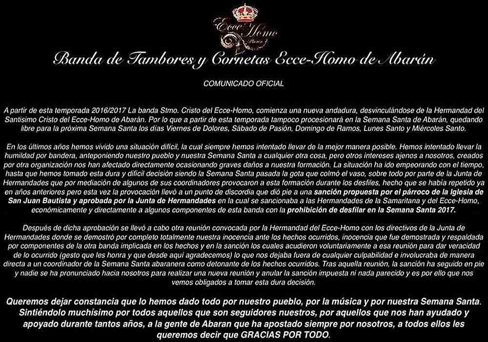 Aunque desde hace meses ya venía siendo un rumor, lo cierto es que, finalmente, a través de un comunicado, la Banda de Tambores y Cornetas Stmo. Cristo del Ecce-Homo de Abarán, ha hecho pública su decisión -primero-, de dejar de estar vinculada a la hermandad del Stmo. Cristo del Ecce-homo, y, segundo, de no procesionar en la Semana Santa de Abarán, anunciando que queda libre para adquirir compromisos esos días en actos procesionales donde se requiera su presencia. De hecho, la Hermandad y Cofradía de Nuestro Padre Jesús de la Caída, de Elche, ya ha anunciado que contará con la banda de Abarán para la procesión del Martes Santo.