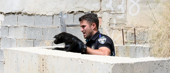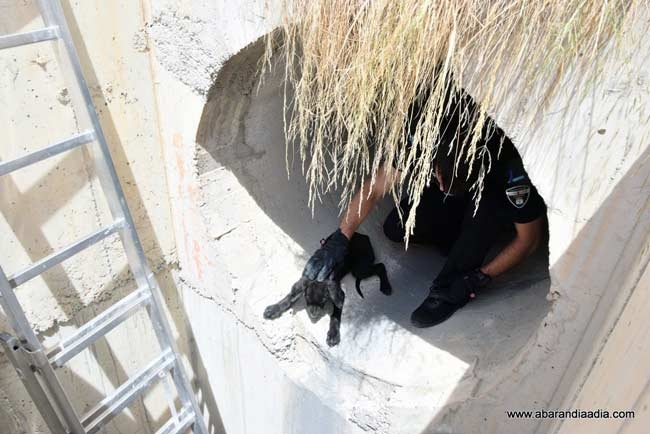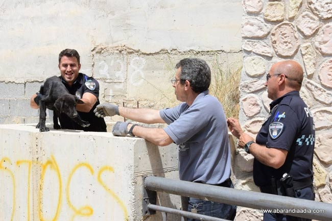 Una vecina que pasaba por la zona alertó por teléfono a la Policía Local tras escuchar los desesperados ladridos del animal pidiendo ayuda. Los agentes se desplazaron hasta el lugar indicado, y, aunque en esa primera visita no consiguieron dar con él, volvieron a intentarlo poco después descubriendo entonces que el can estaba dentro de un tubo de recogida de pluviales que desemboca en el parque del Judío, en una especie de arqueta de difícil acceso.