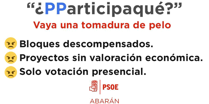 Un comunicado remitido este lunes por el Partido Socialista en Abarán a propósito de la votación de participación ciudadana para la elección de proyectos del Plan de Obras y Servicios, califica esta iniciativa «como una tomadura de pelo y un agravio a la convivencia».