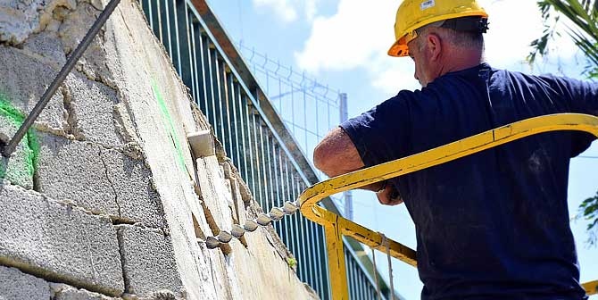 Los trabajos, que, salvo complicaciones inesperadas concluirán esta misma semana, están siendo realizados por la empresa de cimentaciones especiales Ciment Group, de Molina de Segura, y consisten en perforaciones en varias partes del muro para la colocación de micropilotes -unos elemento de forma cilíndrica de pequeño diámetro-, que refuerzan la estructura y que son inyectados con cemento de alta dosificación en una o varias fases.