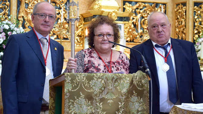 Amalia recoge el testigo de José Carrasco, y ha sido precisamente éste el encargado de presentarla, dedicándole incontables palabras de cariño y recordando que la ya Hermana Mayor de los patronos de Abarán «no se pierde ningún año la salida de la procesión del día 26, porque, aunque no esté presente materialmente, desde su casa en Sevilla oye el tañir de las campanas y el desfilar de los 'pequeñicos' Cosme y Damián, porque nunca falta alguien que le mande un video o fotos de ese emotivo momento», venía a decir Pepe Jarras.