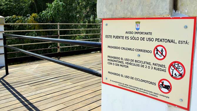 Una señal informativa colocada a ambos lados del puente indica la prohibición de cruzarlo corriendo y de hacerlo sobre bicicletas, patines, monopatines o vehículos de dos o tres ruedas con o sin motor, y, por supuesto, queda terminantemente prohibido el uso de ciclomotores.
