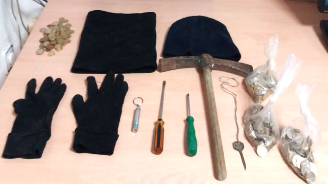 En el momento del arresto, el detenido llevaba una bolsa en cuyo interior portaba una picoleta de albañil, dos destornilladores, una ganzúa, varias bolsas con monedas (aproximadamente unos 400 euros), y varios tiques de pago con tarjeta pertenecientes al bar asaltado.