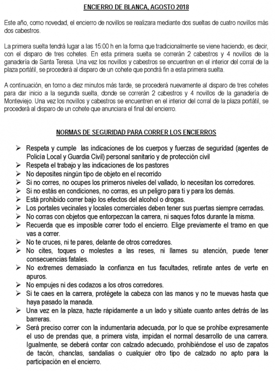 El Ayuntamiento de Blanca ha hecho público un comunicado relativo al Encierro de Blanca, declarado de Interés Turístico Regional, resaltando, además de algunas normas básicas y de obligado cumplimiento para público y corredores, que este año, como principal novedad, «el encierro de novillos se realizará mediante dos sueltas», con cuatro novillos, más dos cabestros, en cada una de ellas.