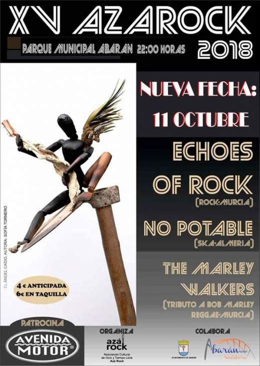 Con motivo de la celebración de esta edición, la número quince, el colectivo Azá Rock ha querido contar con un elemento conmemorativo: una obra creada por las manos y el talento de la abaranera Sofía Tornero, que lleva por título 'El ángel caído', una escultura que se sustenta sobre el conocido apero de labranza que da nombre al festival y que aparece como tema principal en su cartel anunciador de este año.