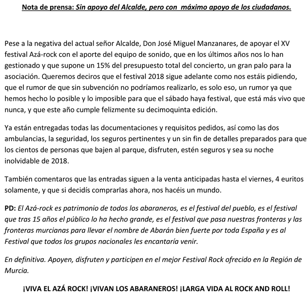 El colectivo Azá Rock, a través de un comunicado de prensa, ha querido desmentir algunos rumores en el sentido de que el festival de este año no se celebraría. La nota de prensa expone que «Pese a la negativa del alcalde, José Miguel Manzanares, de apoyar el XV festival Azá-Rock con el aporte del equipo de sonido, que en los últimos años nos lo han gestionado y que supone un 15% del presupuesto total del concierto, queremos deciros que el festival 2018 sigue adelante como nos estáis pidiendo».