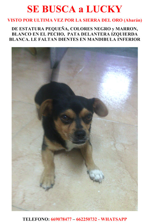 Aunque ya ha pasado una semana desde que se le echa de menos, la familia de Lucky no pierde la esperanza de volver a encontrarse con él. En su búsqueda, además de emprender una masiva campaña divulgativa a través de las redes sociales, sus dueños han llenado de carteles buena parte del municipio esperando que alguien pueda aportar alguna pista sobre su paradero. Lucky tiene nueve años, es ratero y, como particularidad, su pata delantera izquierda es de color blanco y le faltan algunos dientes en la mandíbula inferior.