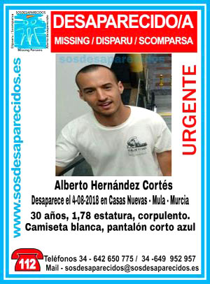 La Guardia Civil sigue buscándolo por tierra y por aire al vecino de Mula del que no se sabe nada desde la tarde del pasado sábado. Se traja de una persona de 30 años de edad, corpulento y de 1,78 metros de estatura. La última vez que fue visto vestía con una camiseta blanca y un pantalón corto azul. Fuentes cercanas al caso aseguran que el hombre, aunque reside en la ciudad de Murcia, es natural de la citada pedanía muleña y que no es la primera vez que desaparece.