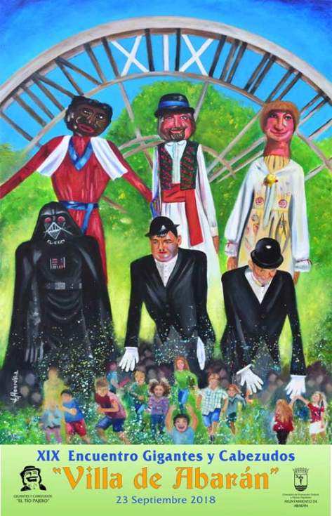 A través de un colorido cartel en el que aparecen seis de los personajes más populares de cuantos integran el universo de cartón-piedra de la Asociación de Gigantes y Cabezudos 'El tío Pajero', el abaranero Jesús Honrubia es al autor del cartel anunciador del XIX Encuentro.