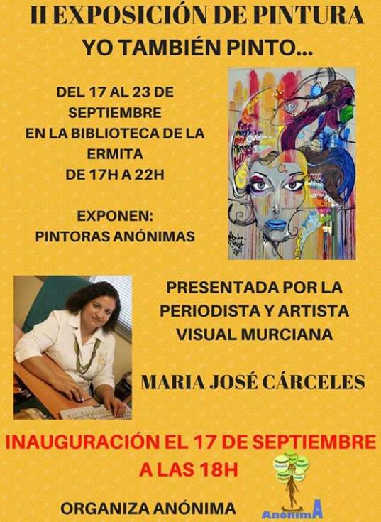La exposición, en la que se pueden ver obras de las siguientes autoras: Carmen Hernández, Laura Carrillo, Antonia Garrido, María Luisa Rocamora, Maribel Tornero, Ofelia Velandrino, Gloria Villalba, Isabel Algueron, y Águeda Carrillo, se podrá visitar en horario de tarde: de 17:00 a 22:00.