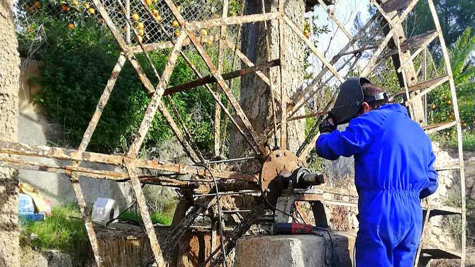 En esta actuación de emergencia se ha podido reparar el eje central y los cojinetes (engrasado, equilibrado y alineado); se han soldado algunos elementos metálicos, y se ha eliminado una gran cantidad de barro incrustado en las palas y los cangilones, principalmente, tal y como nos explicaba Antonio Ariño, que, junto a su hermano Ángel, acudió a la llamada de la Concejalía de Turismo del Ayuntamiento de Abarán, y la de la Comunidad de Regantes, para solventar las deficiencias que habían causado la parada de este elemento hidráulico.