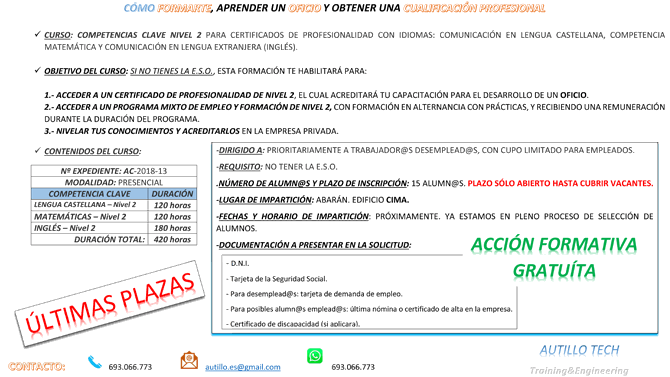 Desde Autillo Tech se informa de la inminente celebración de un interesante CURSO DE COMPETENCIAS CLAVE NIVEL 2: LENGUA CASTELLANA, MATEMÁTICAS y LENGUA EXTRANJERA (INGLÉS) una formación que, próximamente, se realizará por primera vez en Abarán