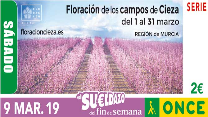 Los cupones de la ONCE del sábado 9 de marzo se llenarán de color a través de la Floración de los Campos de Cieza, que será protagonista a través de los cinco millones y medio de boletos que se pondrán a la venta ese día.