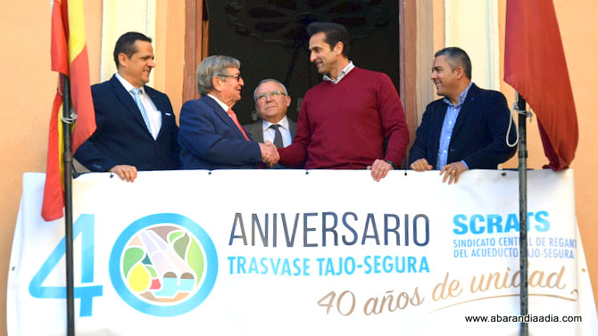 El alcalde de Abarán, José Miguel Manzanares, junto al vicepresidente del Sindicato Central de Regantes del Acueducto Tajo-Segura, José Antonio Andújar, y el diputado regional del PP, Jesús Cano, además de Antonio Morte, vocal del sindicato y secretario de la Comunidad de Regantes de las Vegas Alta y Media del Segura, junto a representantes del Motor Resurrección y del Motor Grupo 1485 de Abarán, desplegaba este viernes una pancarta conmemorativa del 40 Aniversario del Trasvase Tajo Segura, que ya luce en el balcón principal del edificio consistorial.