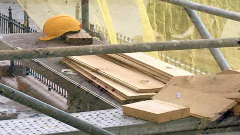 Las tablas de madera que aparecen en la fotografía, que dicen que se están curvando, son las maderas anteriores a la reparación, que se está procediendo a su reposición, por otras en perfecto estado.