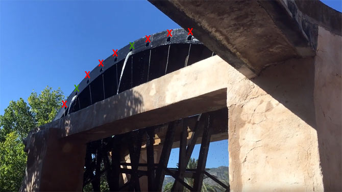 Sin embargo, es muy importante vigilar que para subsanar de forma rápida estas importante deficiencias de sellado en los cangilones no se recurra al uso de productos inadecuados para un elemento declarado Bien de Interés Cultural (BIC), como el poliuretano y otros.