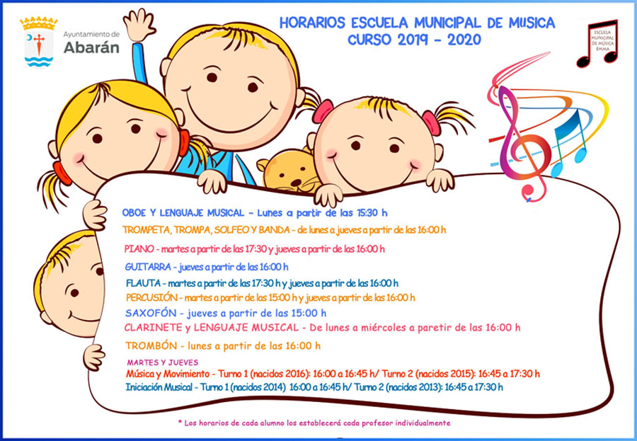 La Concejalía de Cultura del Ayuntamiento de Abarán ha hecho públicos los horarios lectivos referentes a la Escuela Municipal de Música (EMMA) para el presente curso 2019 / 2020, cuyas clases comenzarán a impartirse este jueves día 14. Las enseñanzas que se ofertan son, entre otras, música y movimiento, iniciación musical, trompeta, trompa, trombón, clarinete, flauta, percusión, saxofón, piano, guitarra...