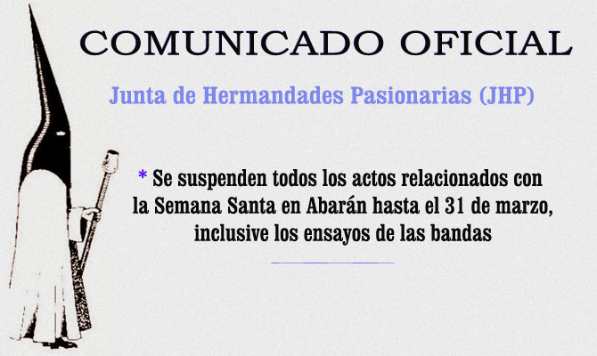 La Junta de Hermandades Pasionarias de Semana Santa de Abarán (JHP), en reunión extraordinaria celebrada este jueves y junto a los concejales de las áreas de Política Social, Adrian Carrillo; de Cultura, Felipe García; de Tradiciones, Jaime Tornero; y de Policía y Seguridad Ciudadana, José Ignacio Carrillo, ante la situación creada por la pandemia del coronavirus en la Región de Murcia y siguiendo las recomendaciones de las autoridades sanitarias, así como de la CARM, han acordado por unanimidad «SUSPENDER hasta el 31 de marzo TODOS LOS ACTOS que organiza esta Junta de Hermandades incluidos los ensayos de las bandas».