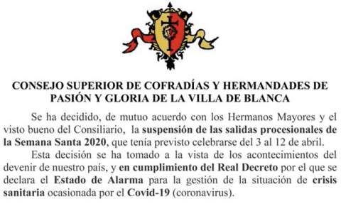 La Junta de Hermandades Pasionarias de Cieza através de un comunicado emitido en la noche de este miércoles 18 de marzo, informo de la «suspensión de las Procesiones de la Semana Santa 2020».