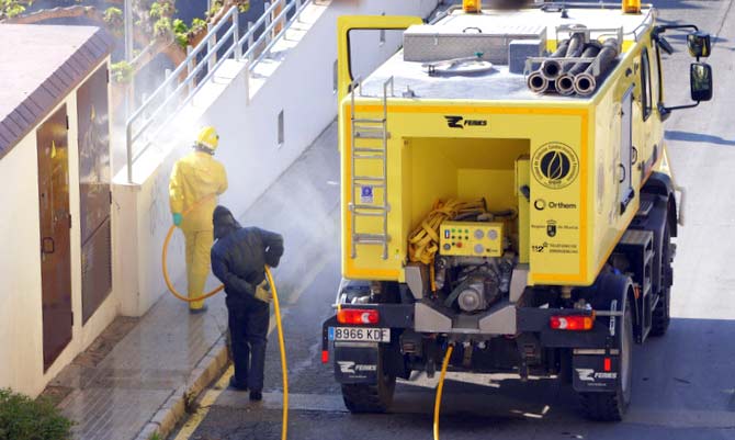 Efectivos de la Unidad de Defensa contra los Incendios Forestales de la Dirección General del Medio Natural (BRIFOR), se han desplegado esta mañana en nuestro municipio para limpiar y desinfectar lugares públicos considerados estratégicos por la Dirección General de Salud Pública en la lucha contra la propagación del coronavirus Covid-19.