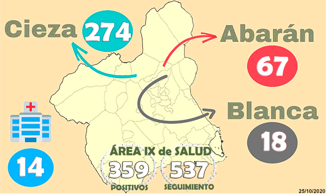 Veinte son los nuevos contagios contabilizados este miércoles dentro del Área IX de Salud, 14 de ellos en Cieza, municipio que se sitúa ya con 190 positivos y donde esperamos y deseamos que las medidas tomadas por su ayuntamiento a principios de esta semana, además de las dictadas desde la Consejería de Salud, comiencen a dar sus frutos más bien pronto que tarde. Abarán suma hoy cinco nuevos contagios para pasar a 48, mientras que Blanca, con uno, vuelve a contar con 9.