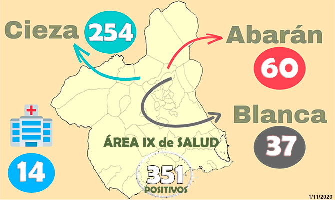 Por último, Blanca vuelve hoy a batir sus peores registros y se sitúa con 26 positivos tras detectarse cuatro nuevos contagios de ayer a hoy por un solo curado. Esta situación eleva de nivel naranja a rojo su centro de salud, circunstancia que ha llevado a su Ayuntamiento a calificar la situación como «complicada. Ahora, más que nunca, es momento de actuar con responsabilidad y cumplir todas las medidas sanitarias».