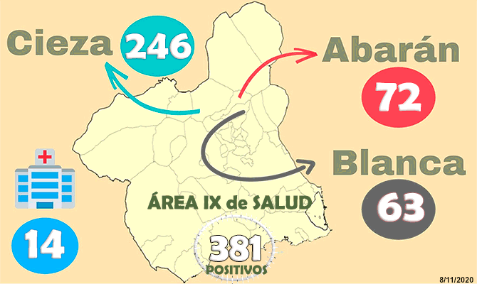 Respecto al total de los positivos en el Área IX de Salud son a fecha de hoy 345 teniendo en cuenta los 232 de Cieza, los 67 de Abarán y los 46 de Blanca.