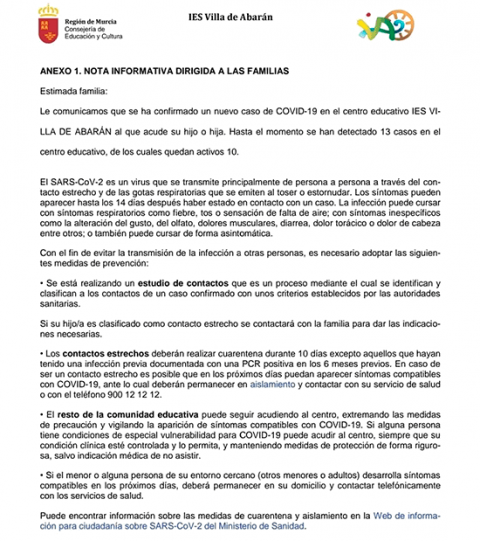 También se ha registrado un positivo en el IES Valle del Segura donde los aislados son nueve: el positivo y otros ocho alumnos.