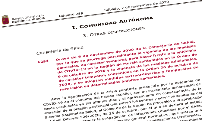 El Boletín Oficial de la Región publica hoy sábado la orden de 6 de noviembre de 2020 de la Consejería de Salud, por la que se adoptan medidas extraordinarias y temporales de restricción en determinados ámbitos sectoriales, entre ellos la actividad de los locales de hostelería y restauración y de aquellos destinados a la prestación de servicios semejantes.