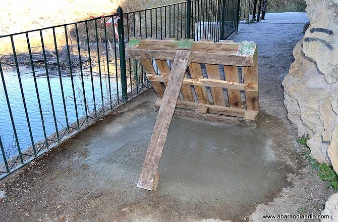 Operarios municipales procedieron a primera hora de la mañana de este martes a reparar el peligroso socavón localizado sobre una acequia, en el paraje abaranero conocido como ‘Las Canales’, en un camino de paso por la ‘Ruta de las Norias’ donde, días atrás, un