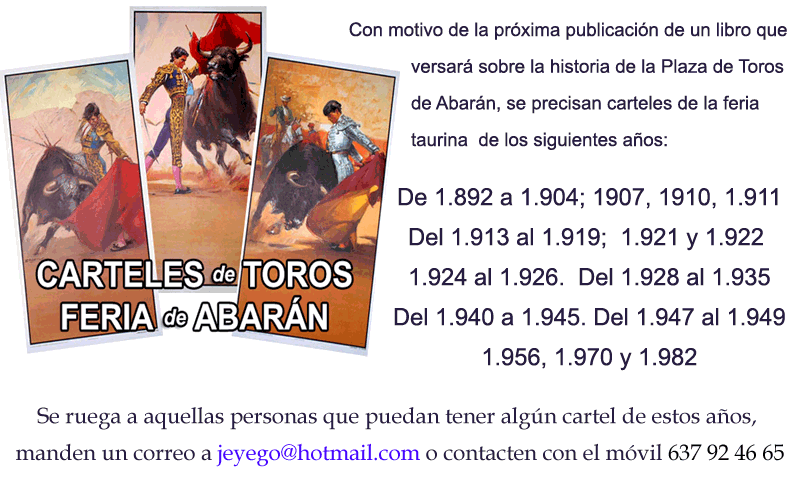 Con motivo de la próxima publicación de un libro que versará sobre la historia de la Plaza de Toros de Abarán, se necesitan carteles de la feria taurina de nuestra localidad de los siguientes años: