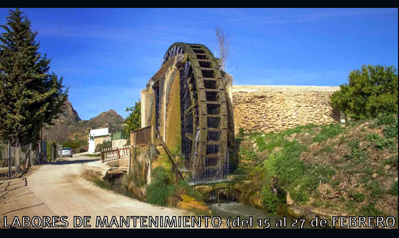 Desde el Heredamiento de la Noria de Don García de Abarán se informa a los comuneros y al público en general que, debido a la realización de labores de mantenimiento, la noria estará parada desde el día 15 al 27 de febrero.