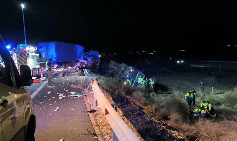Un accidente de tráfico ocurrido en la madrugada de este martes en la Autovía A-33 en sentido Murcia (cerca de Hoya del Campo), en el término municipal de Abarán, se saldó con una persona fallecida y otras dos heridas. En el suceso se vieron implicados dos camiones. La víctima mortal fue el copiloto de uno de camiones que estaba parado tras haber sufrido una avería y que acabó siendo embestido por detrás por el otro camión.