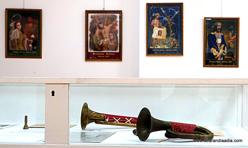 Así mismo y en tres voluminosas vitrinas se ha conseguido exponer la que hasta ahora supone la recopilación más ambiciosa de prospectos de mano que desde el año 1950 vienen anunciando nuestros desfiles procesionales, lo cual ha sido posible gracias a los archivos particulares provenientes del cronista de Abarán, José S. Carrasco Molina, Álvaro Carpena y José Raúl Gómez.
