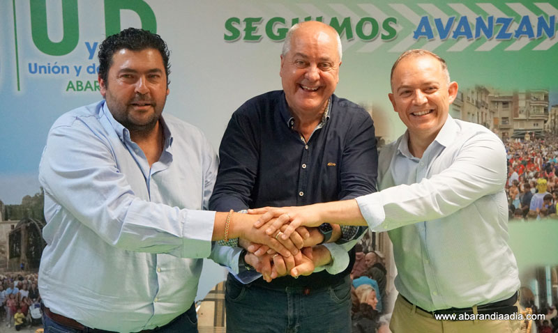 Finalmente, intervenía Jesús Gómez, del Partido Socialista (PSOE). «Ha habido muchos rumores, de todo tipo. Las circunstancias eran muy complicadas para todos y quiero subrayar que el comportamiento en todo momento entre nosotros tres y nuestros grupos ha sido de una total transparencia. Hemos hablado de tú a tú en las distintas reuniones y lo único que se ha puesto sobre la mesa han sido proyectos e ideas, en absoluto cuestiones personales», decía. «Vamos a seguir gestionando día a día sin mirar colores, teniendo clarísimo que el pueblo tiene que seguir adelante para SEGUIR AVANZANDO, como era el lema de Unión y desarrollo, POR MUCHAS RAZONES, como era el lema de Izquierda Unida, y para estar más tiempo CONTIGO, más tiempo con el pueblo de Abarán. Por eso volvemos a unir fuerzas», expresaba.