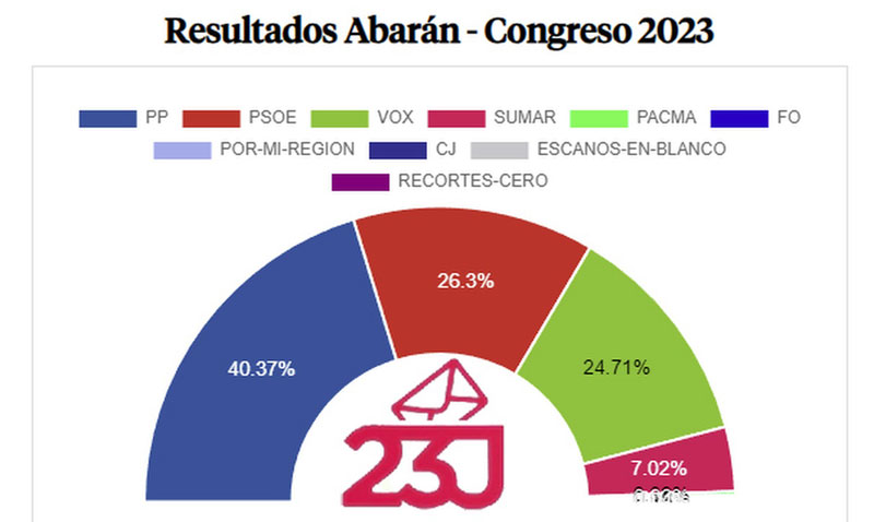 Con el 100% del voto escrutado, el Partido Popular fue la formación política más votada en las Elecciones Generales celebradas el 23 de julio en Abarán. Los populares obtuvieron 2.731 votos, lo que representa el 40,37% del apoyo del electorado, (+13,94%).