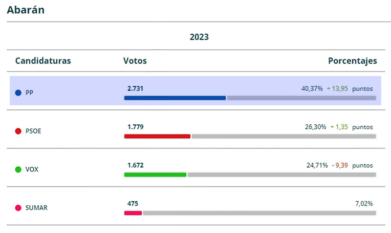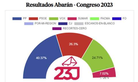 El Partido Popular fue el más votado en todas y cada una de las 17 mesas electorales en las que los vecinos y vecinas de Abarán pudieron ejercer su derecho al voto en las Elecciones Generales 2023 celebradas este domingo. El Partido Socialista fue la segunda fuerza más votada en nueve de las mesas, mientras que VOX lo fue en las ocho restantes.