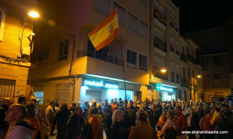 En la concentración, que trascurrió sin ningún tipo de incidente y a la que se sumaron integrantes de la ejecutiva local de VOX Abarán, los manifestantes lucieron banderas con la enseña nacional y corearon vivas a España.