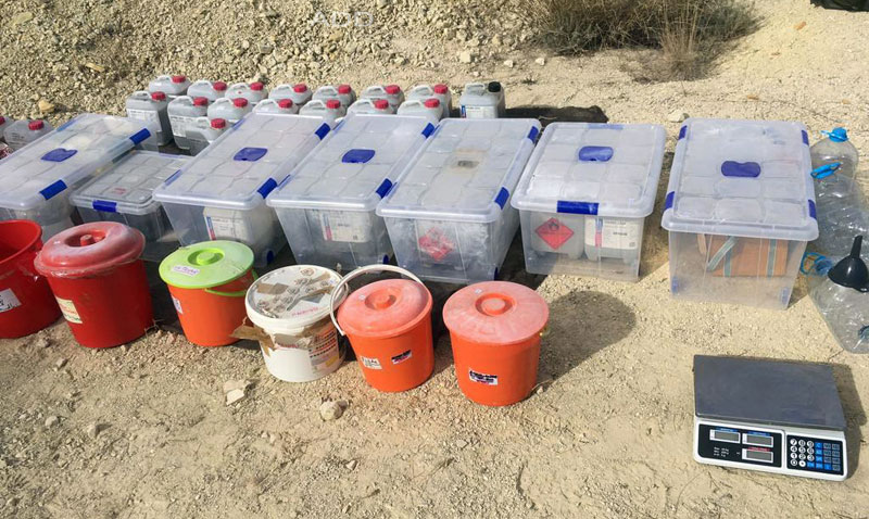 Previamente a este dispositivo policial, los investigadores lograron identificar en Abarán, en el interior de una especie de almacén de una casa-cueva en una zona de difícil acceso, el lugar exacto donde el detenido había construido un zulo para almacenar clandestinamente 180 kilogramos de mercurio y cinabrio, entre otras sustancias, que guardaba en garrafas.