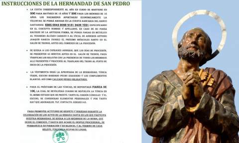 También se pide el máximo respeto para el paso de las bandas de tambores y cornetas y para la banda de música de la Agrupación Musical 'Santa Cecilia', y se recuerda que será obligatorio el uso de un zapato negro con suela negra, entre otras cuestiones.