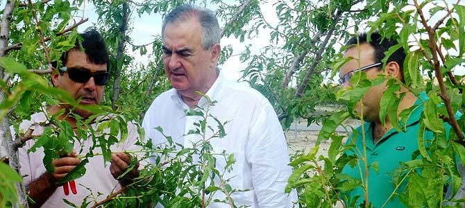 El secretario general del PSRM-PSOE, Rafael González Tovar, que visitó este miércoles los campos de frutales afectados por la granizada del 24 de junio para comprobar ‘in situ’ los daños producidos en las cosechas de melocotón, paraguayo, pera, manzana, ciruela, uva de mesa y otros cultivos -que han quedado inservibles para ser comercializados-, afirmó que «lo importante es reaccionar inmediatamente, y eso es lo que le pedimos al Gobierno regional para que no se pierdan los árboles».