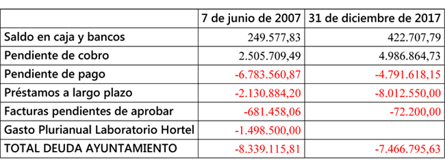 La opiniones son libres, pero los datos oficiales son rotundos: la deuda municipal es menor que en 2007, año en el que empezó la crisis económica y en el que el Partido Popular volvió a gobernar este pueblo.