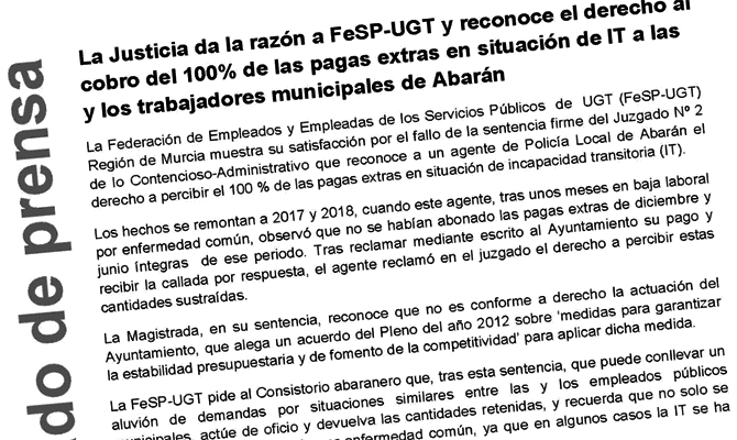 La Federación de Empleados y Empleadas de los Servicios Públicos de UGT (FeSP-UGT) Región de Murcia, ha mostrado hoy su satisfacción por el fallo de Ia sentencia firme del Juzgado Nº 2 de lo Contencioso-Administrativo que reconoce a un agente de Policía Local de Abarán el derecho a percibir el 100% de las pagas extras de las que se le privó durante un periodo en el que estuvo en situación de incapacidad laboral transitoria (IT).
