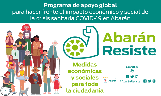 El Ayuntamiento de Abarán, como institución de la Administración más próxima a la ciudadanía, tiene el propósito de articular un programa de apoyo global dirigido al conjunto de la sociedad abaranera, una iniciativa que bajo el lema "Abarán resiste" (a modo y reflejo del carácter luchador de este pueblo), recoge una serie de actuaciones en los ámbitos más importantes y sensibles, para dar respuesta a los problemas existentes hoy y marcar el rumbo para mañana.